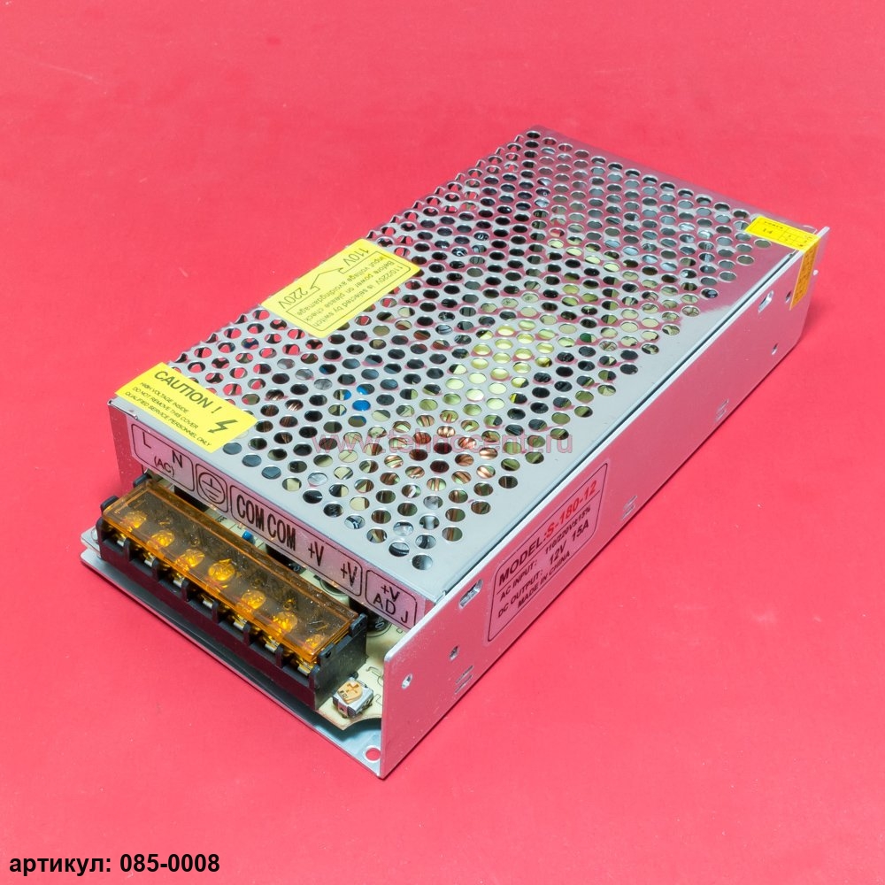 Импульсный блок питания 12V 15A (180W) используется для питания светодиодных ламп, светодиодных лент, модулей и любых устройств на основе LED светодиодов, совокупное потребление которых не превышает 180 Вт. Блок питания имеет прочный металлический корпус, благодаря перфорации хорошо реализован отток воздуха от нагревающихся элементов. Блок питания подключается к сети 220V и оснащен защитой от перенапряжения, короткого замыкания, перегрузки, электромагнитных помех.