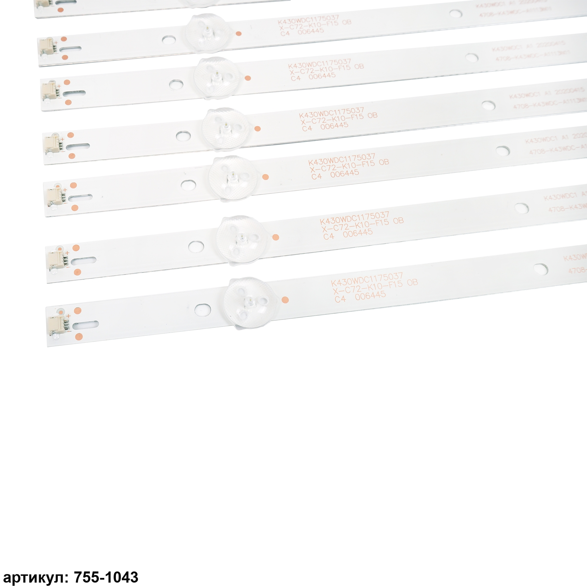 Комплект планок светодиодной подсветки для телевизора Philips 43' / (3 led 6V 389mm) Комплект включает в себя: - 8 планок 4708-K43WDC-A1113N11Совместимые p/n: K430WDC1 А1, K430WDC1 А3, K430WDC1175037 Подходит для моделей телевизора: Philips 43PFS4012, 43PFS4012/12, 43PFF3012, 43PFF3012/T3, 43PFF5012, 43PFF5012/T3, 43DL4012N, 43DL4012N/62; AOC LE43M3570, LE43M3570/60, LE43M3579, LE43M3579/60, 43M3083, 43M3083/60S; Changhong 43Y3000H; Dahua DH-LM43-F200; TCL Y43G1B, L43E6800