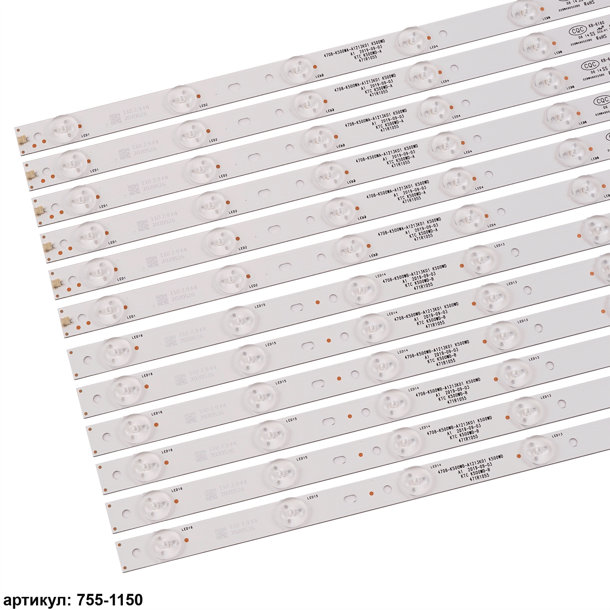 Комплект планок светодиодной подсветки для телевизора Philips 50'/ (16 led 3V 985mm) Комплект включает в себя:- 6 планок KTC K500WD-A (8 led) (495) mm- 6 планок KTC K500WD-B (8 led) (495) mmСовместимые p/n: KTC K500WD-A, KTC K500WD-B, 4708-K500WB-A1213K01, K500WD A1, 4708-K500WA-A1213K01Подходит для моделей телевизора: Philips 50PFL3040/T3, 50PFL5040/T3, 50PFL5141/T3, TCL LE50D8900, LE50D8800, LE50D59, LE50D69, Lenovo 50A21Y, 50E31Y, Panda LE50K35S, LE50K33S