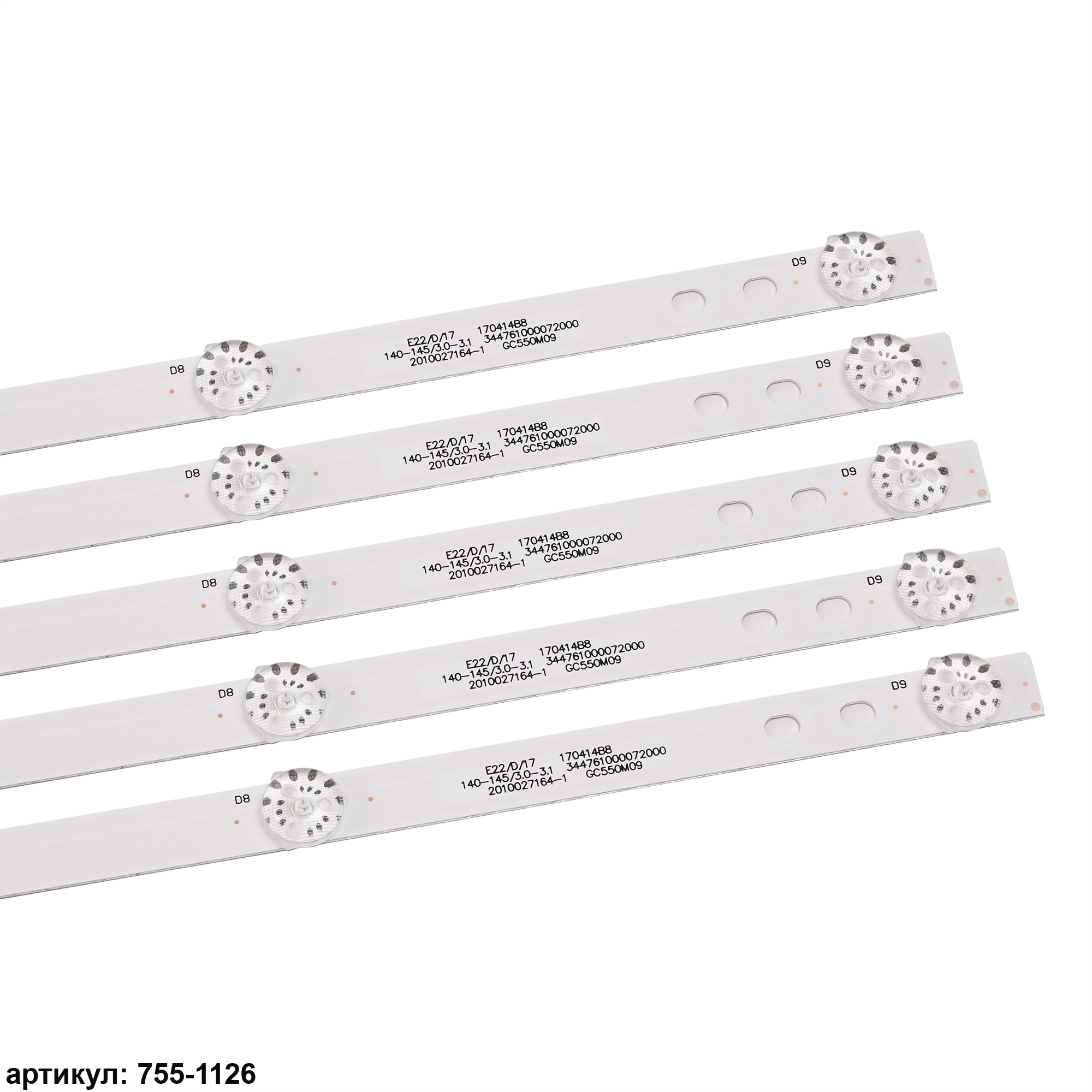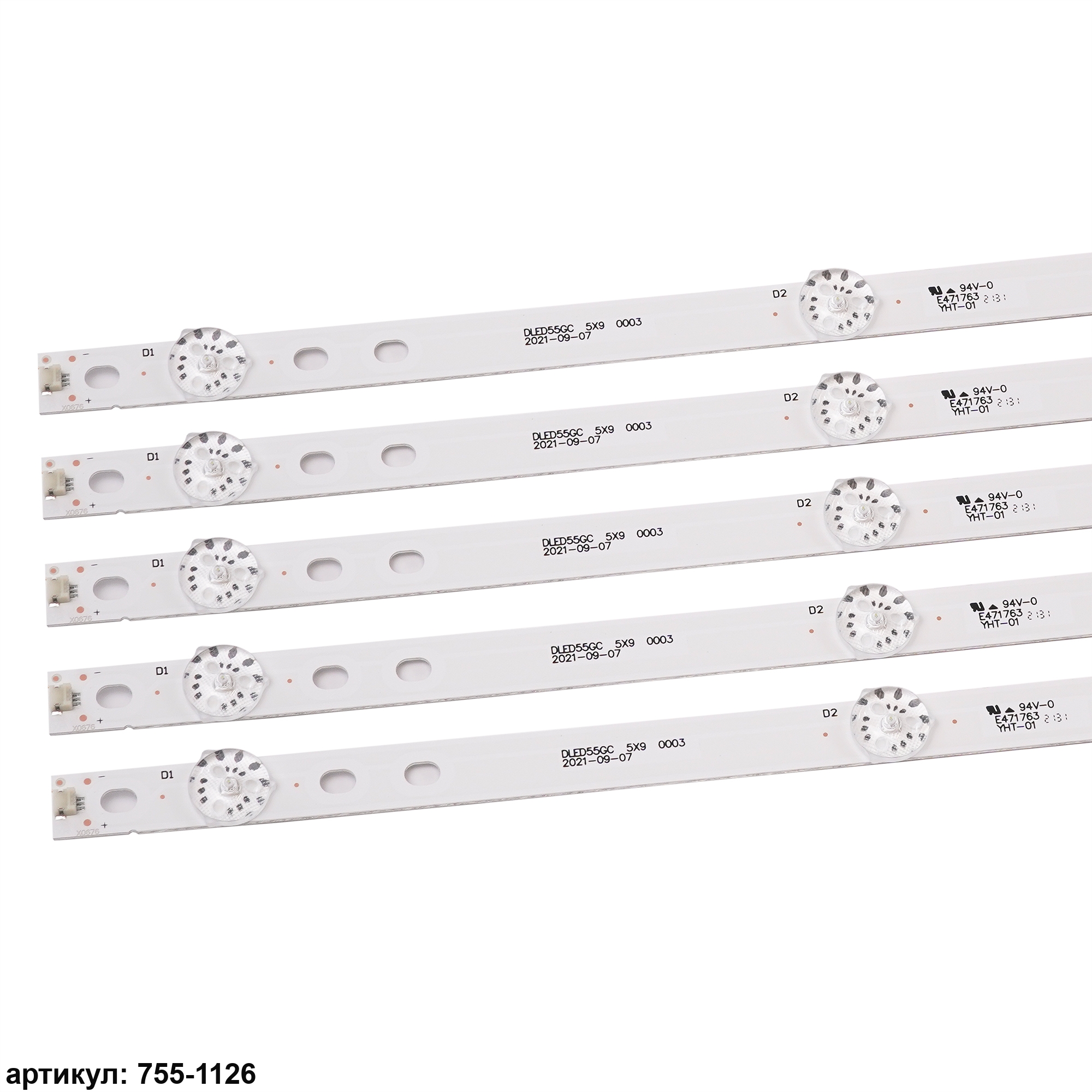 Комплект планок светодиодной подсветки для телевизора Philips 55'/ (9 led 3V 1105mm) Комплект включает в себя:- 5 планок GC55D09-ZC22AG-07Совместимые p/n: GC55D09-ZC22AG-07, 303GC550042, DLED55GC 5X9 0003Подходит для моделей телевизора: Philips 55PUF6012/T3, 55PUF6392/T3, AOC LE55U7178, Haier H55E17A