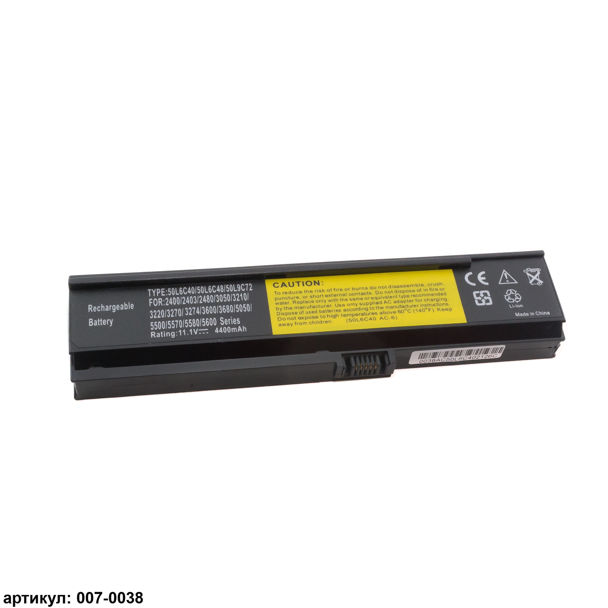 Совместимые P/N: 50L6C40, L50L6C48, L50L6C72, L50L9C72, 3UR18650F-3-QC262, 3UR18650Y-2-QC261, 3UR18650Y-3-QC262, 4UR18650Y-QC271, BATEFL50L6C40, BATEFL50L6C48, BATEFL50L6C72, BATEFL50L9C72, BT.00603.006, BT.00603.010, BT.00603.030, BT.00603.031, BT.00604.001, BT.00604.004, BT.00604.007, BT.00604.012, BT.00903.007, CGR-B/6H5, CL1335B.806, E204007, LC.BTP00.001, LC.BTP00.002, LC.BTP01.006, LIP6220QUPCE236872, LIP6220QUPC SY6