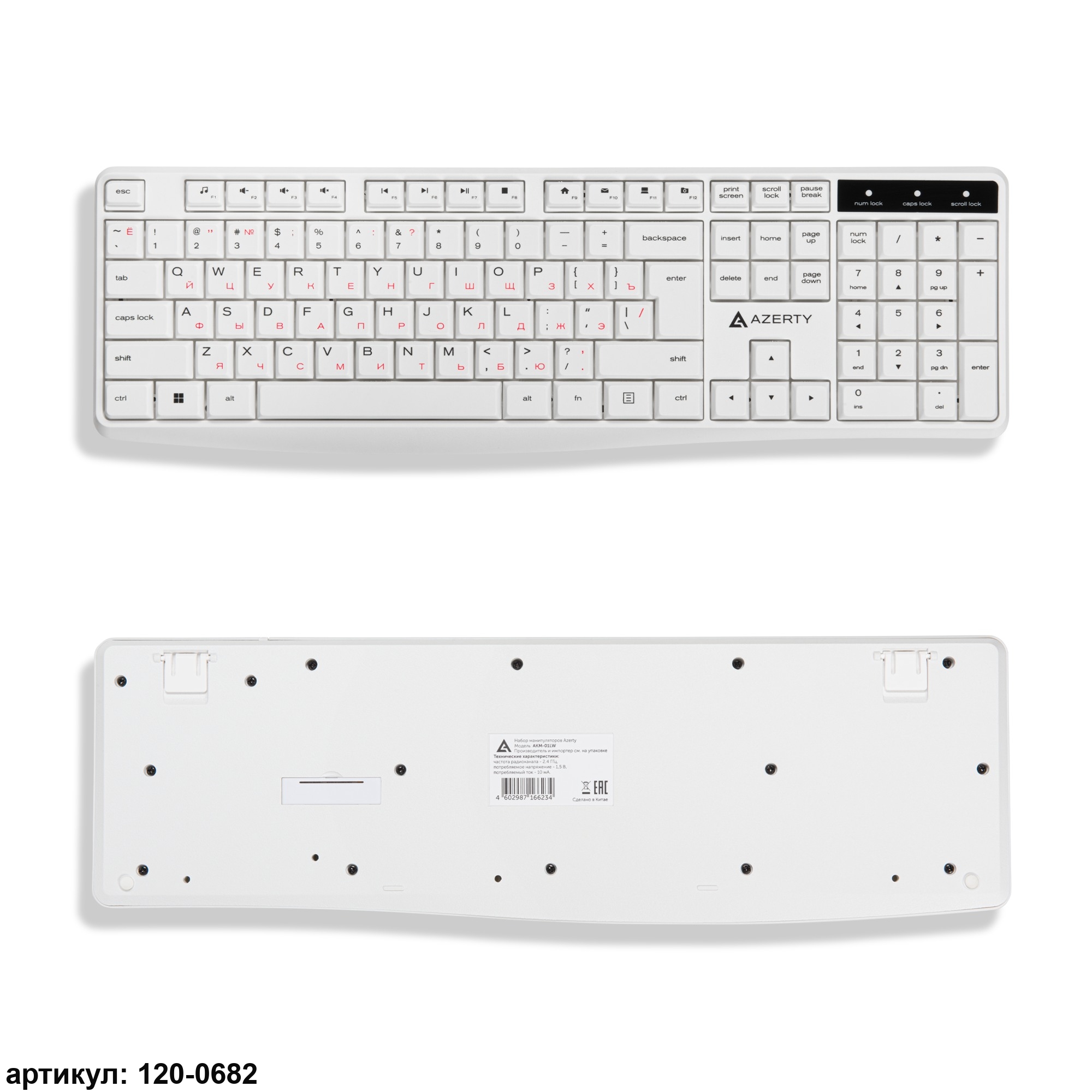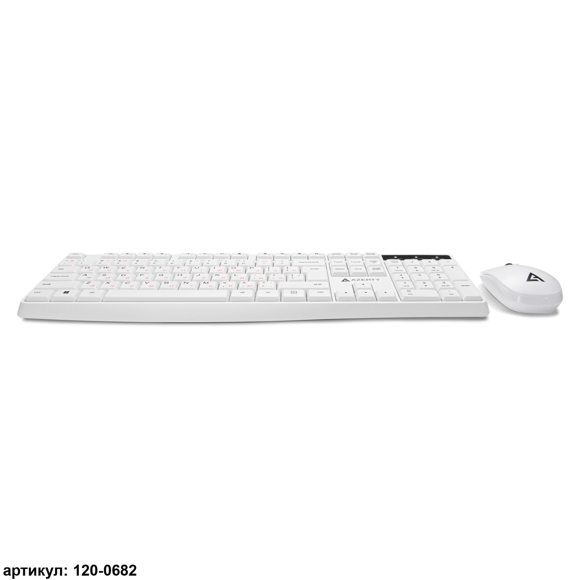 Комплект манипуляторов Azerty AKM-01LW состоит из клавиатуры и мыши. Он может использоваться для комплексного управления и ввода данных на персональных компьютерах и других совместимых устройствах, таких как планшеты и телевизионные приставки. Устройства изготовлены из безопасного и прочного пластика белого цвета. Материал имеет приятную на ощупь фактуру и износостоек. Клавиатура мембранного типа является полноразмерной, со 104 клавишами (ресурс 10 млн. нажатий), а оптическая мышь – светодиодной, с двумя рабочими клавишами (ресурс 3 млн. нажатий), кнопкой-колесом и кнопкой переключения разрешения. Мышь имеет симметричный дизайн, подходящий для использования как правой, так и левой рукой.