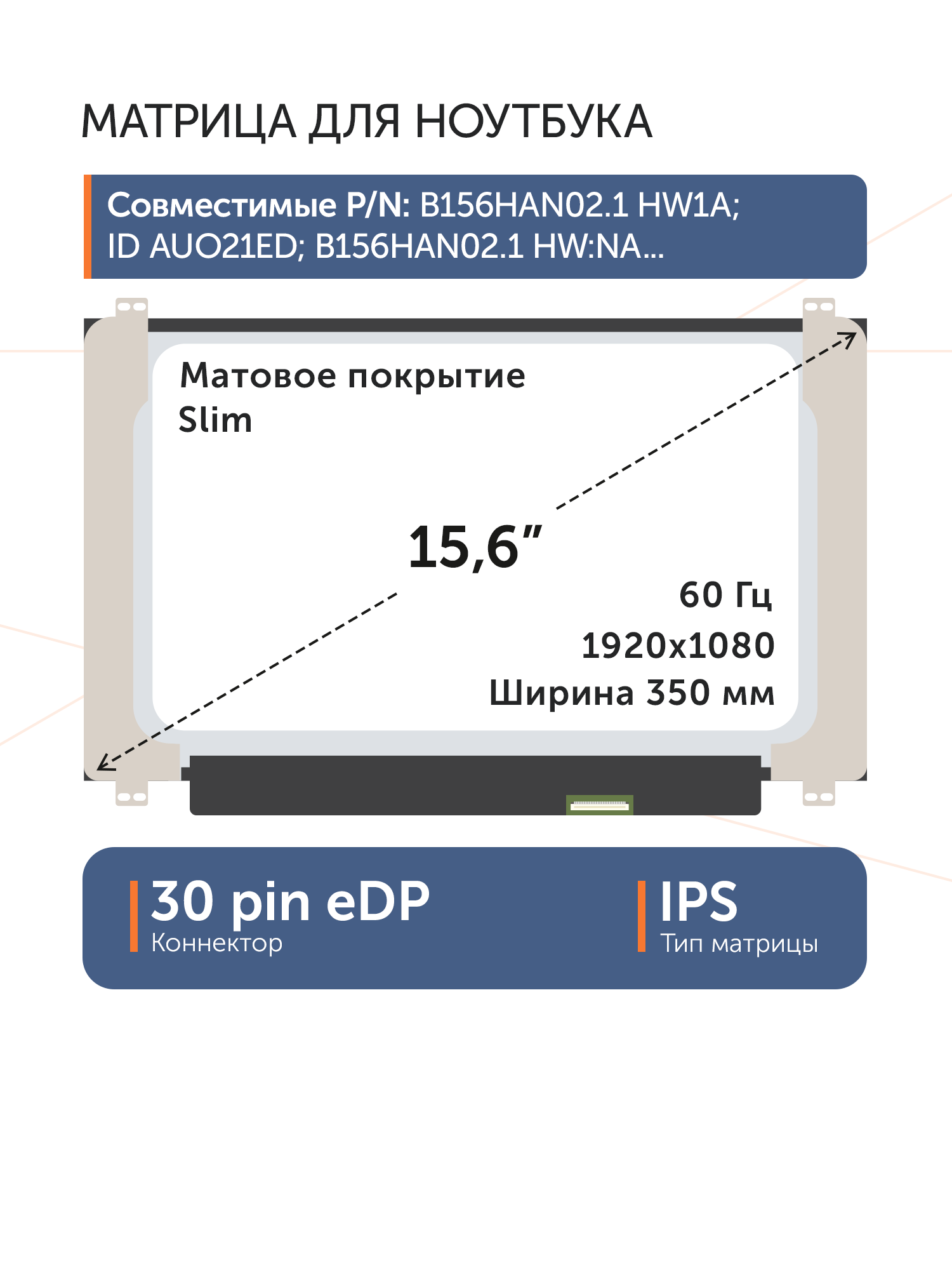 Совместимые модели: B156HAN02.2, B156HAN02.7, B156HAN02.3, B156HAN02.8, B156HAN02.1, LM156LFCL03, LM156LFCL13, LM156LFBL02, LM156LF4L01, LM156LFCL11, LM156LFCL01, LM156LFCL10, LM156LFAL01, LM156LF5L03, LM156LFCL05, LM156LFBL03, LM156LFCL07, LM156LFCL12, LM156LFAL02, LM156LF5L06, LM156LF5L04, LP156WF5(SP)(A2), LP156WF9(SP)(L2), LP156WF9(SP)(L9), LP156WF9(SP)(L1), LP156WF9(SP)(K1), LP156WF9(SP)(M3), LP156WF9(SP)(M9), LP156WF9(SP)(M1), LP156WF9(SP)(C1), LP156WFC(SP)(C1), LP156WFF(SP)(B1), LP156WFC(SP)(D2), LP156WFC(SP)(D3), LP156WFC(SP)(D5), LP156WFC(SP)(D7), LP156WFC(SP)(D1), N156HCA-EBB, N156HCA-EBA, N156HCA-EAB, NV156FHM-N48, NV156FHM-N35, NV156FHM-N45, NV156FHM-N4S, NV156FHM-N3D, LP156WFC(SP)(F6), NE156FHM-N41, NE156FHM-NS0, NV156FHM-N4X, TV156FHM-NH1