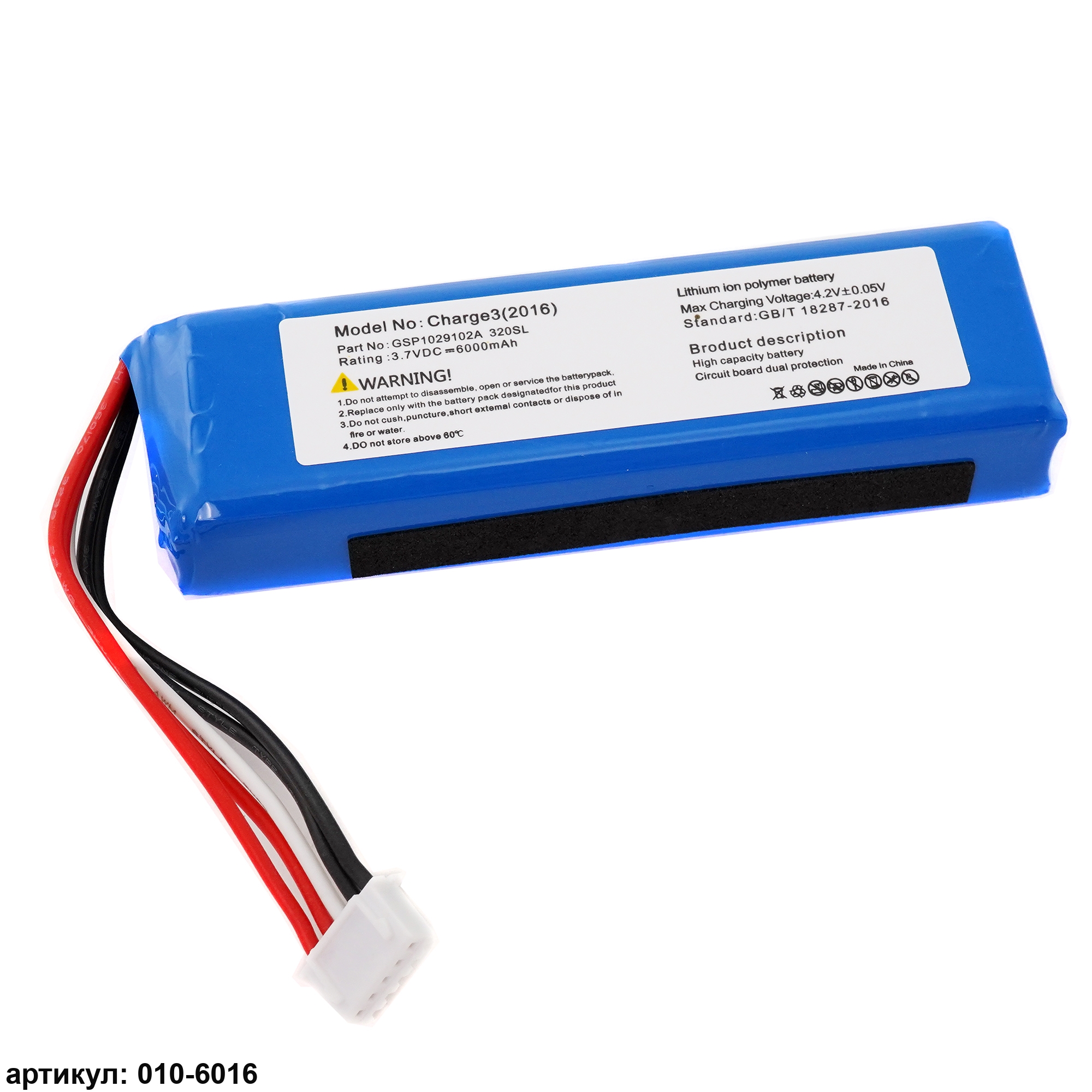 Подходит к колонкам: JBL Charge 3 (3.7V 6000mAh) прямая полярность 2016г.Совместимые p/n: GSP1029102A