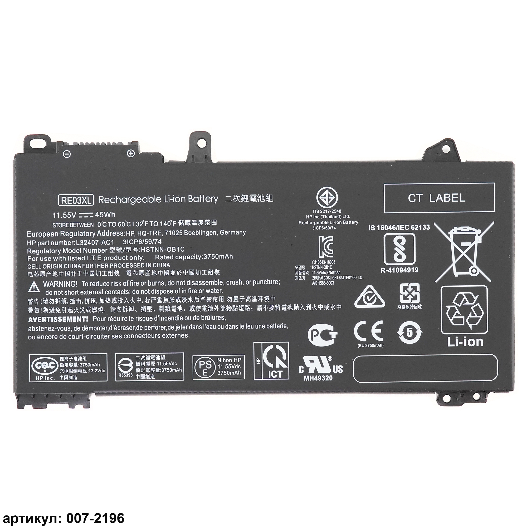 Совместимые P/N: RE03XL, HSTNN-OB1Q, L32656-005, L32407-AC1, L84354-005, L32407-2B1, HSTNN-0B1C, L83685-AC1, L32407-2C1, L32407-2C2, HSTNN-DB9A, L32656-002, L32407-AC2, RF03XL, HSTNN-0B1Q, L32407-541, HSTNN-OB1C