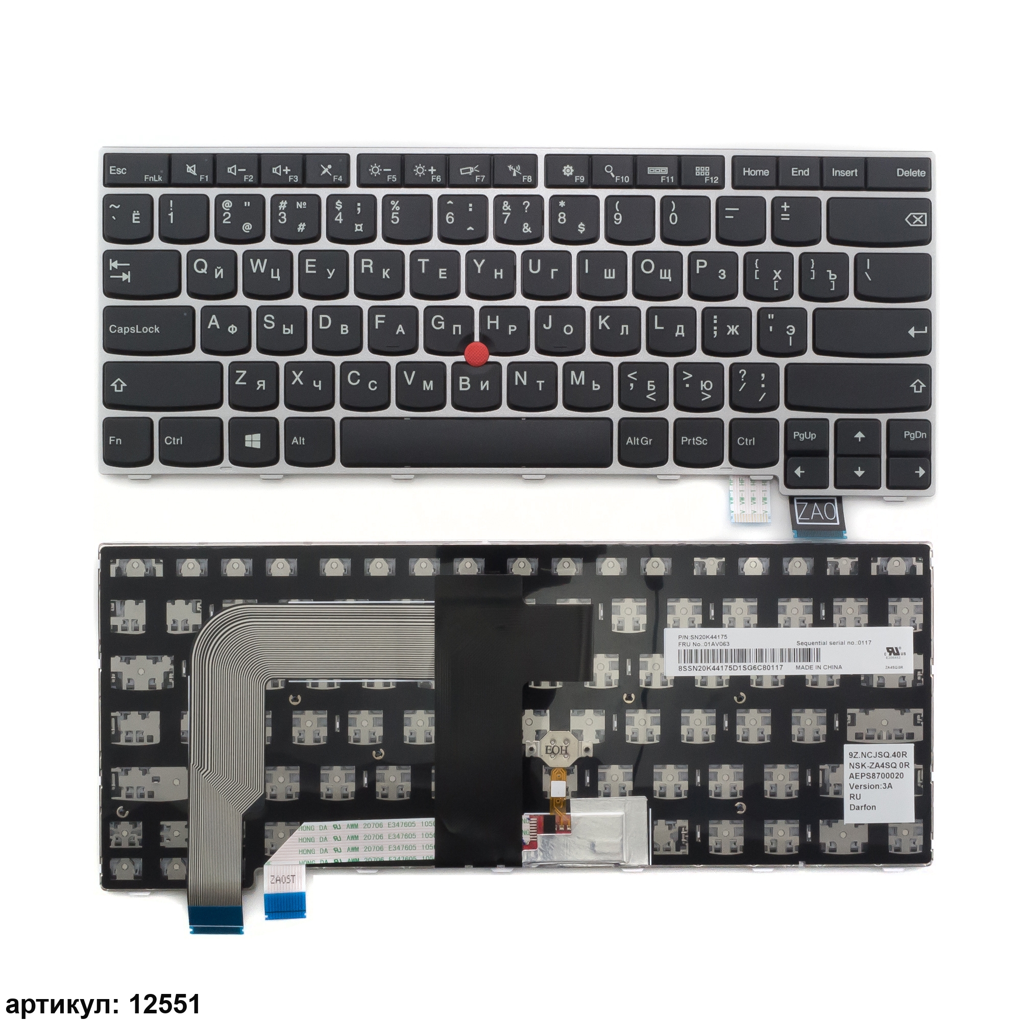 Клавиатура для ноутбука Lenovo ThinkPad T470s черная с серебристой рамкой, со стиком