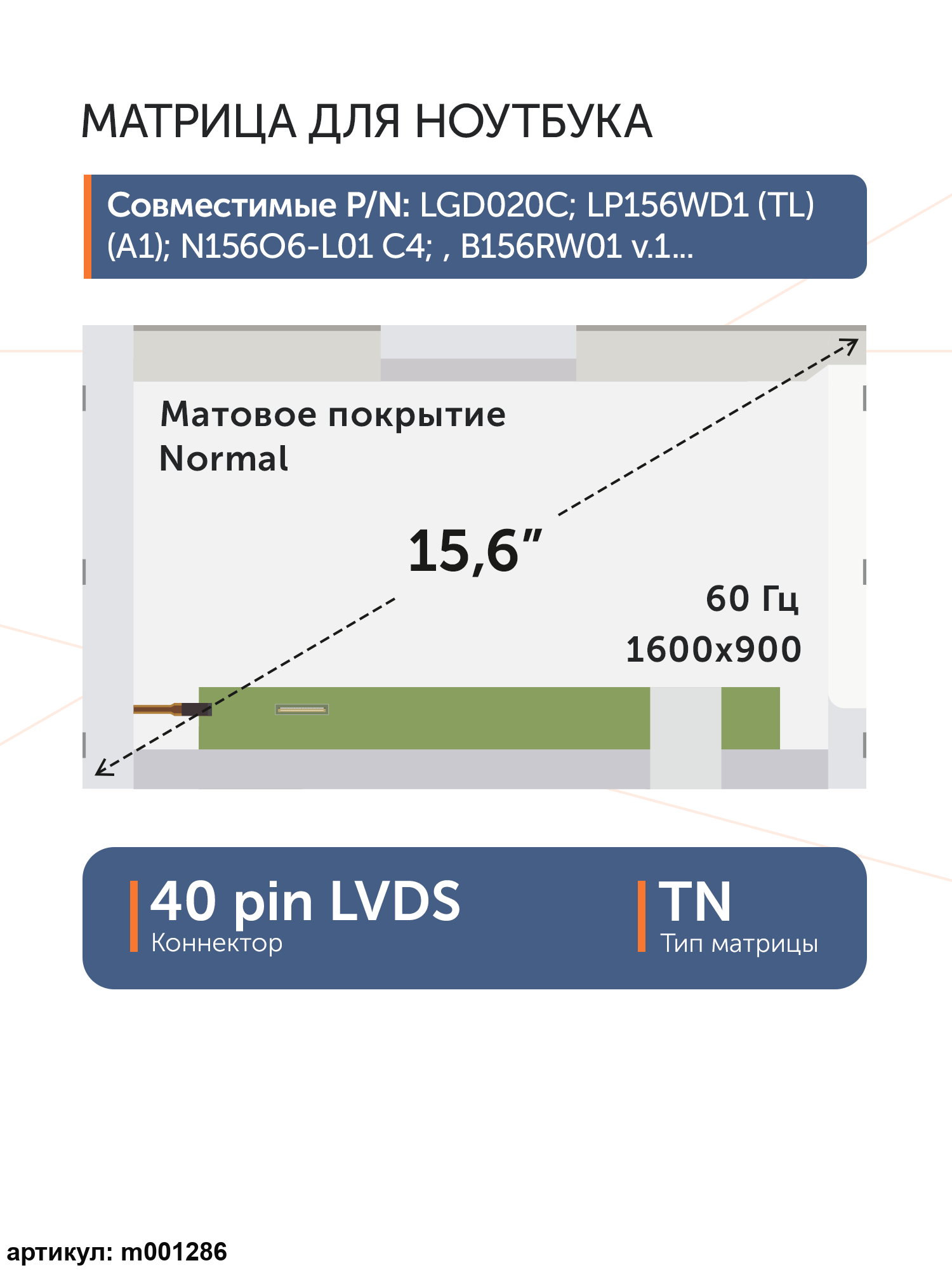 Матрица стандартная (normal), без креплений.Разъем подключения расположен слева внизу на внешней плате.Совместимые модели: LP156WD1 (TL)(B2), LTN156KT04, LP156WD1-TLB4, LP156WD1(TL)(B4), LP156WD1-TLD5, LP156WD1(TL)(D5), LTN156KT02, N156O6-L02, LP156WD1-TLD3, LP156WD1(TL)(D3), LP156WD1(TL)(B3), LP156WD1-TLB1, LP156WD1(TL)(B1), LP156WD1-TLA2, LP156WD1(TL)(A2), LP156WD1-TLA1, LP156WD1(TL)(A1), B156RW01 V.3, B156RW01 V.1, B156RW01 V.0