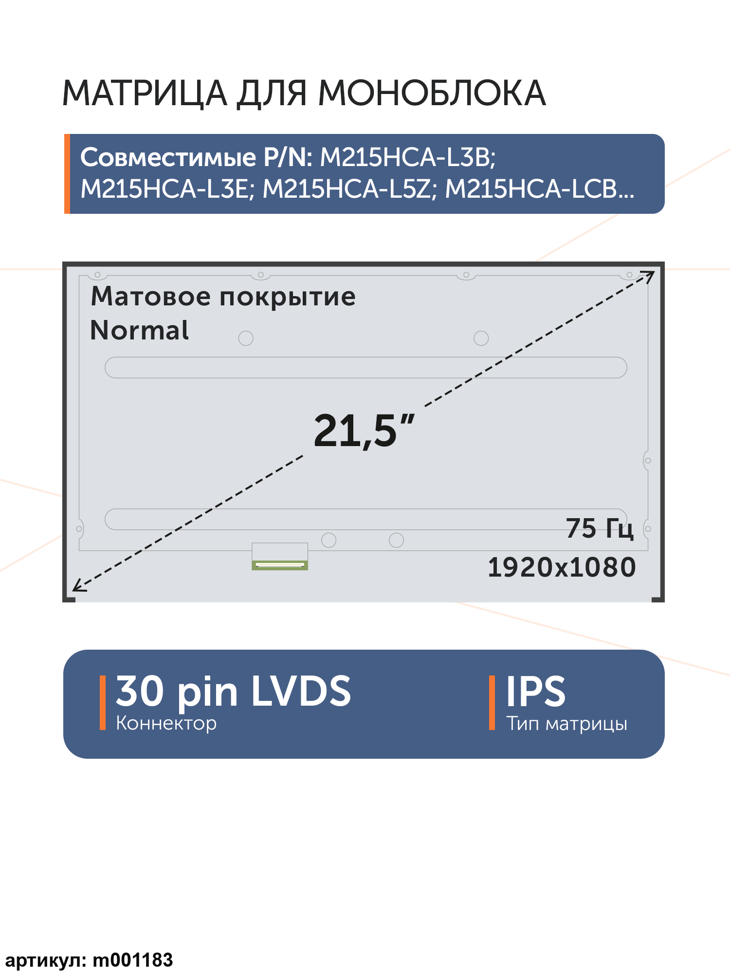 Матрица для монитора, моноблока, телевизора.Расположение разъема снизу слева.Совместимые модели: M215HCA-L3B, M215HCA-L3E, M215HCA-L5Z, M215HCA-LCB, M215HCA-LCZ, M215HCA-P02