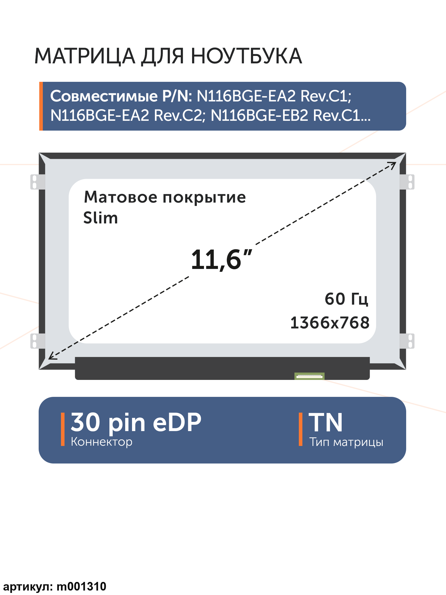 Совместимые модели: B116XTN02.1, B116XTN02.3, B116XTN01.0 HW2A, B116XTN01.0 HW5A, B116XTN02.0, B116XTN02.1 HW0A, B116XTN02.3 HW0A, B116XTN02.3 HW2B, N116BGE-EA2, N116BGE-E32, N116BGE-E32 REV.C1, N116BGE-E32 REV.C2, N116BGE-EA2, N116BGE-EA2 REV.C1, N116BGE-EA2 REV.C2, N116BGE-EA2 REV.C3, N116BGE-EB2 REV.C1, N116BGE-EB2 REV.C2, N116BGE-EB2 REV.C3, N116BGE-EB2 REV.C4, N116BGE-EB2 REV.C5, N116BGE-EB2 REV.C6, N116BGE-E42, NT116WHM-N11, NT116WHM-N21, NT116WHM-N23, M116NWR1 R7.