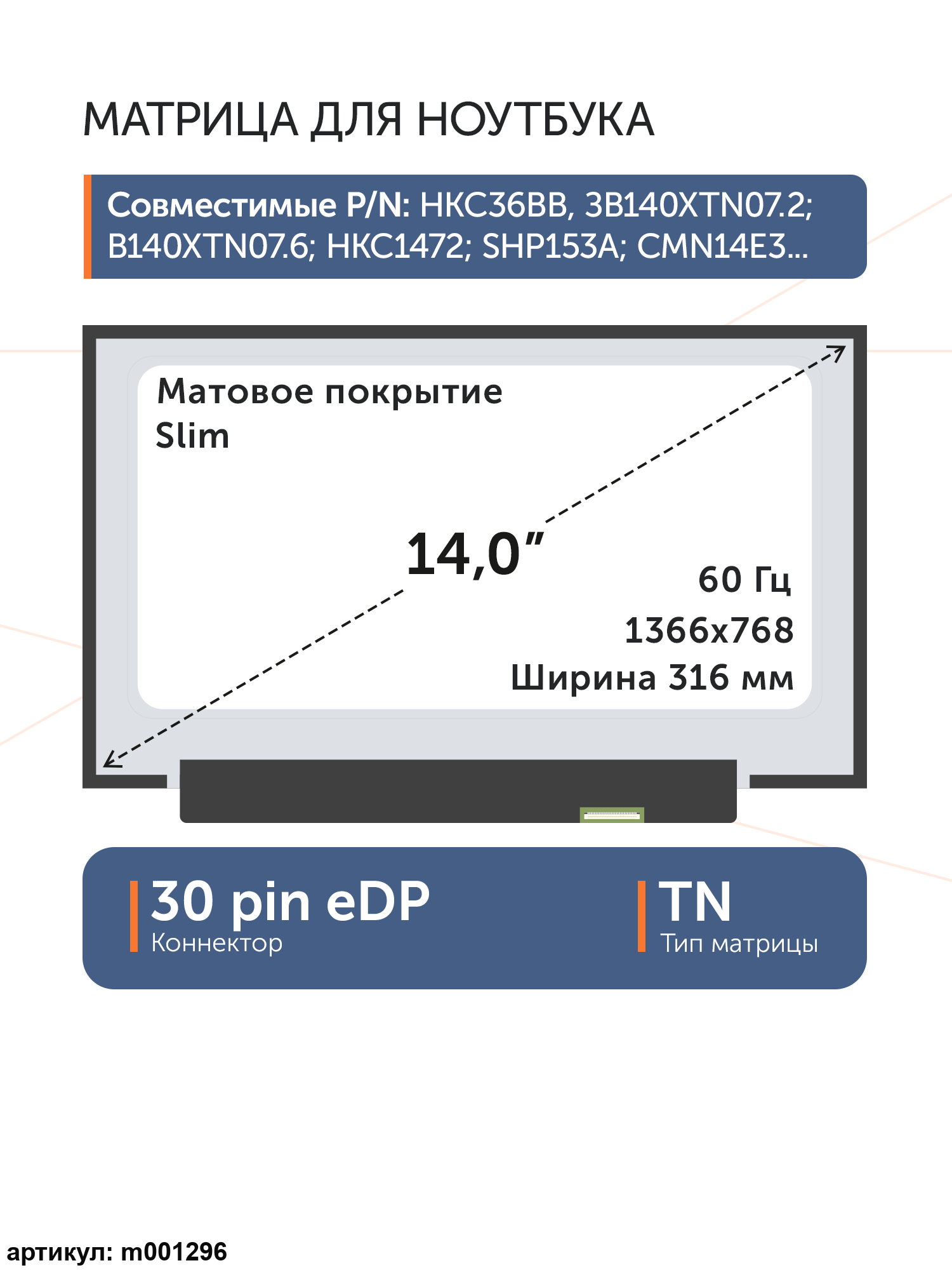 Матрица тонкая (Slim), без креплений.Разъем подключения расположен справа внизу на внешней плате.Совместимые модели: N140BGA-EA4 Rev. C4, NT140WHM-N51, B140XTN07.6, M140NWR8 R1, LQ140T1JH01, MB140AN01-2, NT140WHM-N61, MB140AN01-5, MB140AN01-1, NT140WHM-N44, NT140WHM-N49, B140XTN07.7, B140XTN07.3, NT140WHM-N46, NT140WHM-N34, B140XTN07.2, NT140WHM-N43 V8.0