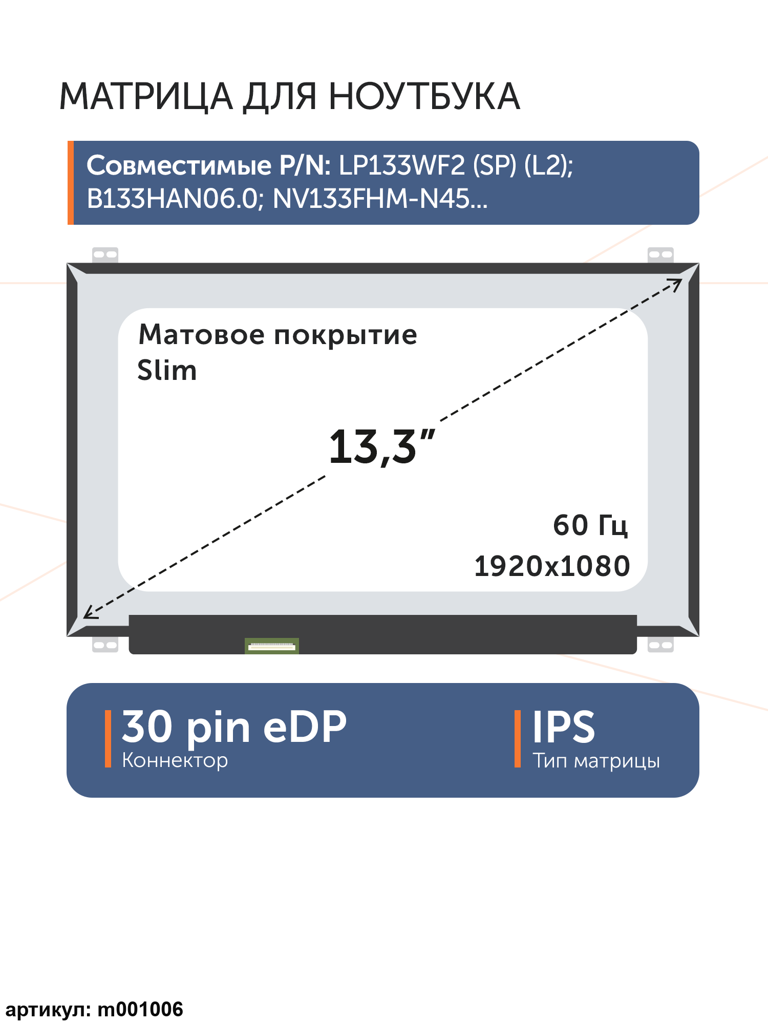 Матрица тонкая (slim), крепления расположены сверху и снизу.Разъем расположен снизу слева на внешней плате.Тип матрицы: IPSСовместимые модели: LP133WF2 (SP)(L2), NV133FHM-N44, B133HAN06.0, NV133FHM-N45, NV133FHM-N44, N133HCE-EAA Rev. B2, NV133FHM-N43