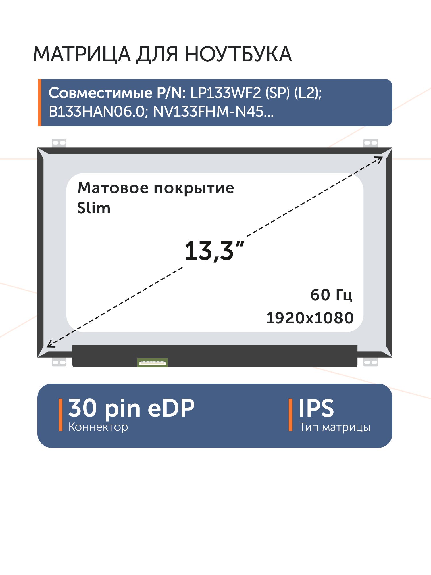 Совместимые модели: LP133WF2 (SP)(L2), NV133FHM-N44, B133HAN06.0, NV133FHM-N45, NV133FHM-N44, N133HCE-EAA Rev. B2, NV133FHM-N43