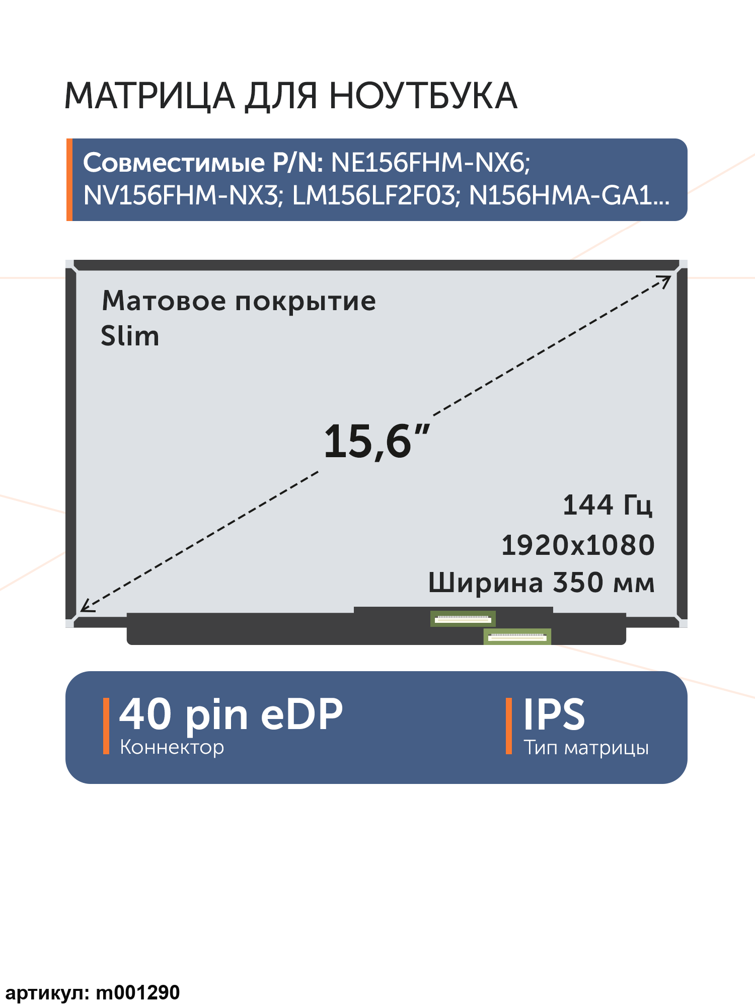 Совместимые модели: B156HAN08.0, B156HAN08.3, B156HAN08.4, B156HAN09.2, B156HAN10.0, LP156WFG(SP)(B3), LP156WFG-SPB3, LP156WFG(SP)(F6), LP156WFG-SPF6, LP156WFG(SP)(B4), LP156WFG-SPB4, LP156WFG(SP)(P1), LP156WFG-SPP1, LP156WFG(SP)(F3), LP156WFG-SPF3, LP156WFG(SP)(B2), LP156WFG-SPB2, LP156WFG(SP)(F2), N156HMA-EA1, N156HMA-GA1, N156HME-GAK, N156HRA-EA1, NV156FHM-N4N, NV156FHM-NX3, NV156FHM-NX4, NV156FHM-NX5, NV156FHM-N4G, NV156FHM-NY4, LM156LF1F02, LM156LF2F01, LM156LF2F03, N156HRA-EA1 REV.C2