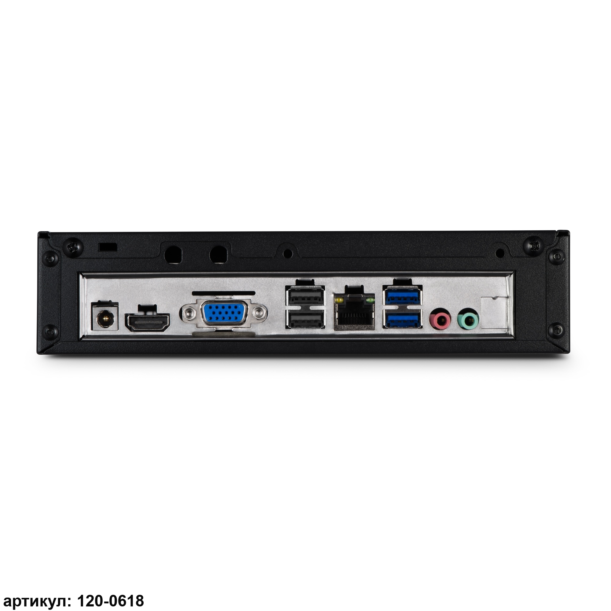 Этот неттоп выполнен в классическом дизайне с элементами минимализма. Металлический с пластиковыми вставками корпус черного цвета сразу привлекает внимание. На передней панели для удобства расположены разъемы USB и mini-jack для микрофона и наушников.