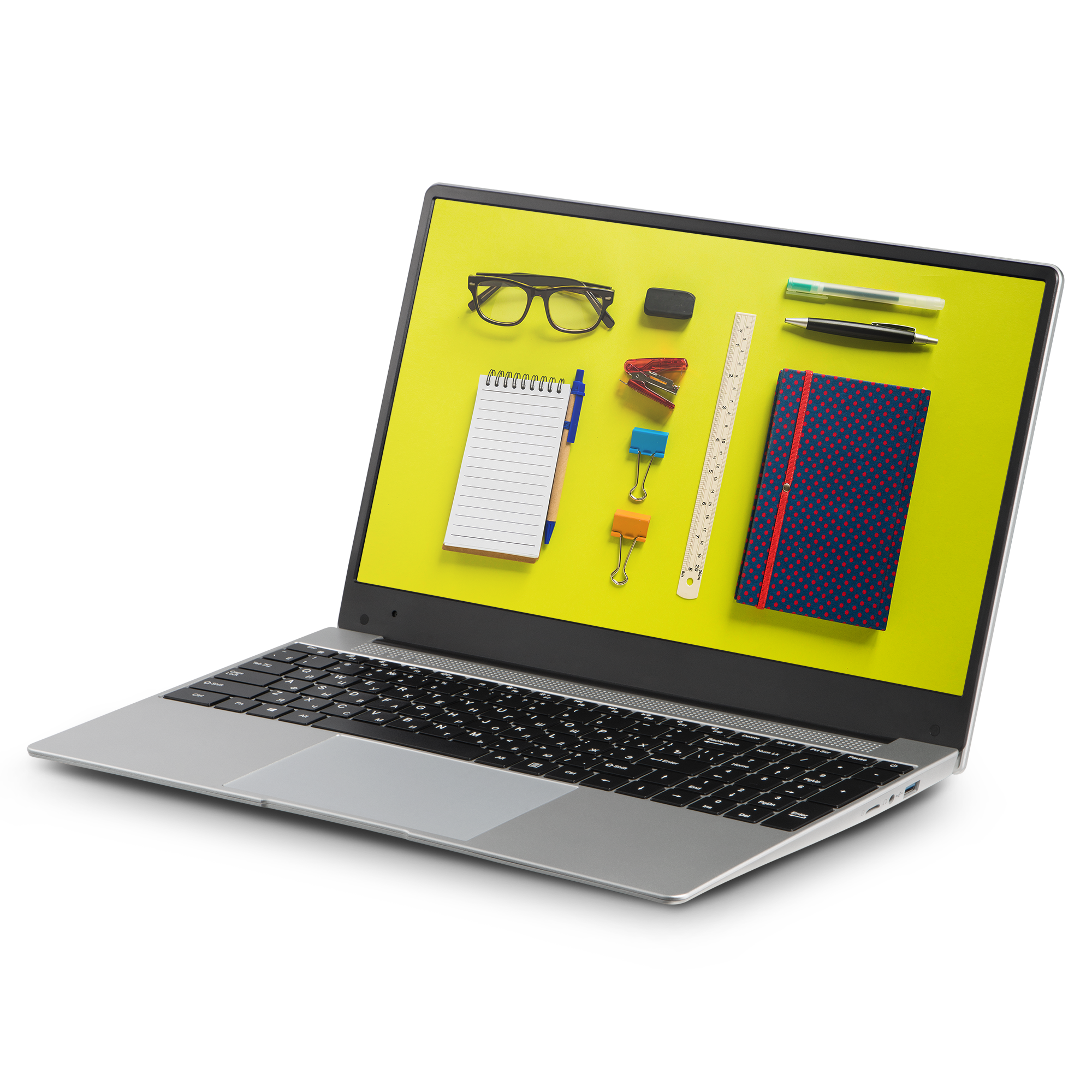 Корпус ноутбука выполнен из твердого полимерного пластика, придающего легкости и прочности. Этот материал обладает высокой устойчивостью к механическим воздействиям, царапинам и потёртостям, а также снижает вес устройства, что делает его удобным для переноски.