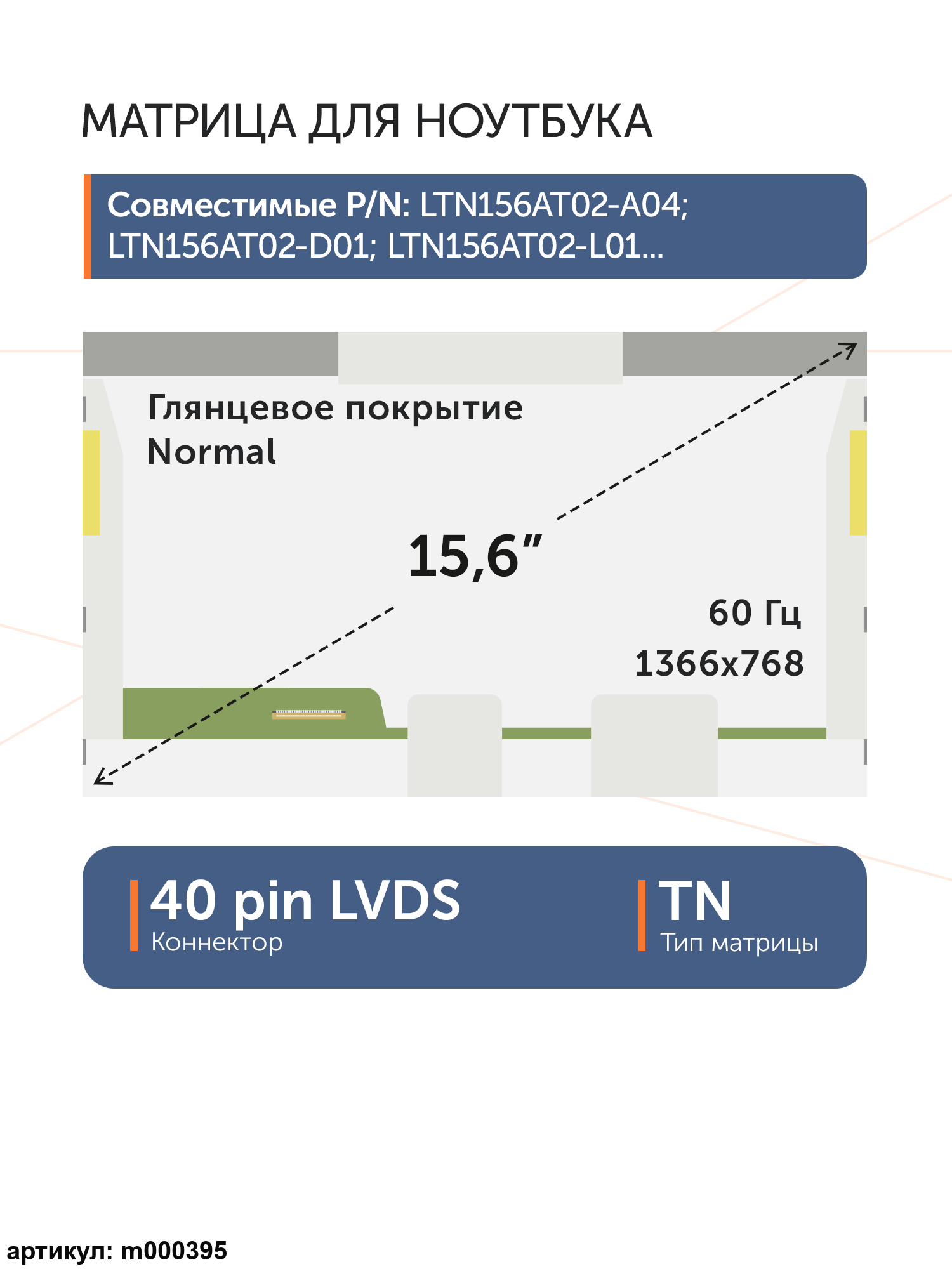 Матрица стандарт (Normal), без креплений.Разъем подключения расположен слева внизу на внешней плате.Совместимые модели: N156B6-L10, HT156WXB-502, CLAA156WB13A, BT156GW01 V.A, LP156WH4(TL)(A1), LP156WH4-TLR2, LP156WH4(TL)(R2), B156XW02 V.1, LP156WH2-TLFA, LP156WH2(TL)(FA), BT156GW02 V.0, NT156WHM-N50 (версия 2), B156XTN02.2, LTN156AT22, B156XTN02.3, LP156WH2-TLH2, LP156WH2(TL)(H2), LP156WH4-TLD2, LP156WH4(TL)(D2), LP156WH4-TLP2, LP156WH4(TL)(P2), LP156WH4-TLN3, LP156WH4(TL)(N3), LP156WH4-TLQ1, LP156WH4(TL)(Q1), HB156WX1-200, LP156WH4-TLC2, LP156WH4(TL)(C2), LTN156AT32, LP156WH2-TLBA, LP156WH2(TL)(BA), LP156WH4-TJA1, LP156WH4(TJ)(A1), B156XW02 V.7, LTN156AT24 B01, BT156GW01 V.4, HT156WXB-500, LTN156AT28, LP156WH4-TLQ2, LP156WH4(TL)(Q2), LP156WH4-TLR1, LP156WH4(TL)(R1), LP156WH4(TL)(P1), LP156WH2-TLAD, LP156WH2(TL)(AD), B156XTN02.0, LP156WH4-TLN1, LP156WH4(TL)(N1), LTN156AT27, M156NWR2 R0, B156XTN02.4, LP156WH4-TLN2, LP156WH4(TL)(N2), HB156WX1-100, B156XTN02.1, LP156WH4-TLD1, LP156WH4(TL)(D1), LP156WH2-TLG1, LP156WH2(TL)(G1), LP156WH2(TL)(G2), B156XW02 V.3, LTN156AT23, BT156GW01 V.3, BT156GW01 V.1, BT156GW01 V.6, BT156GW01 V.2, LTN156AT24, LTN156AT17, LTN156AT16, LP156WH4-TLC1, LP156WH4(TL)(C1), LP156WH4-TLB1, LP156WH4(TL)(B1)