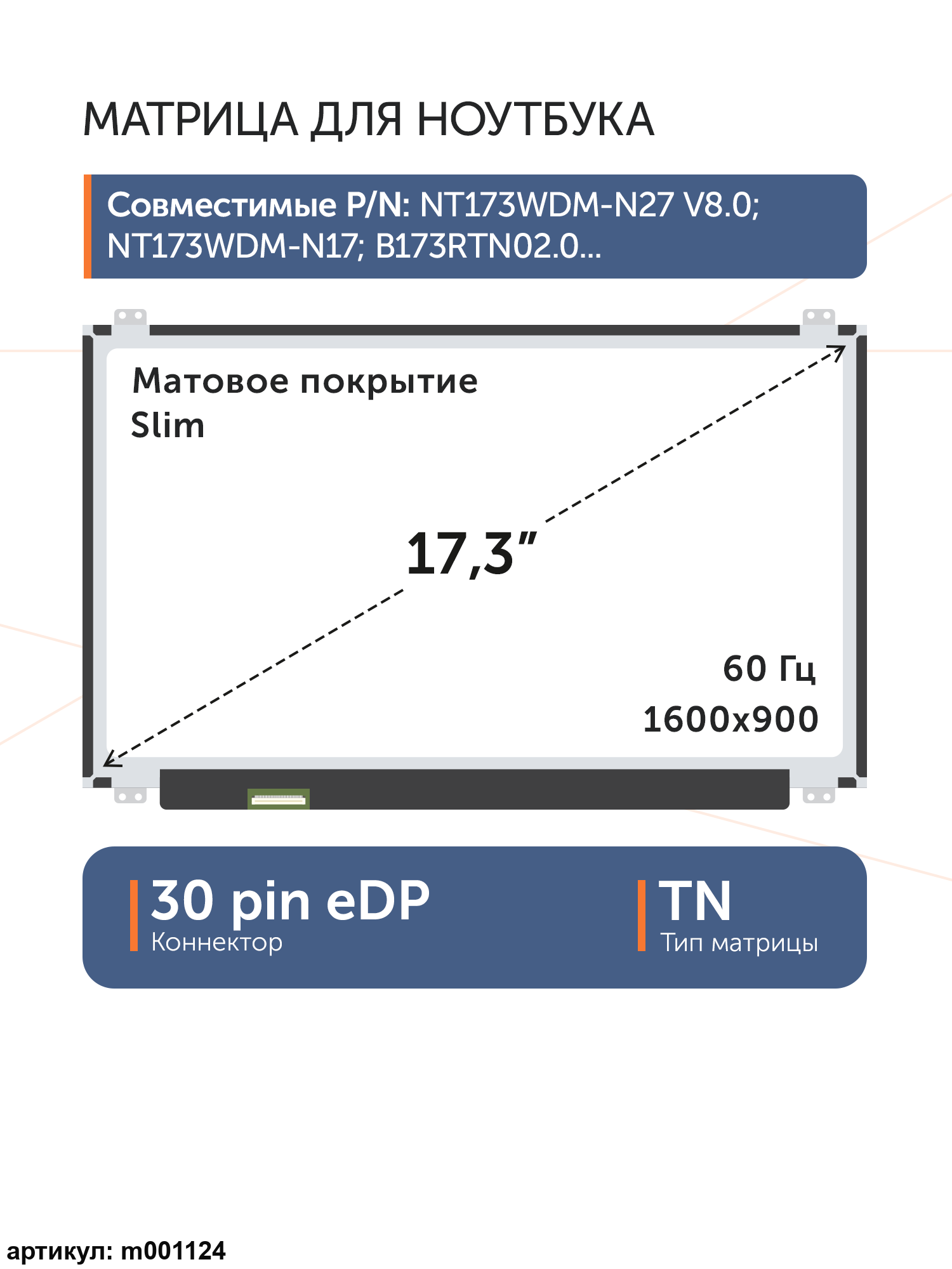 Совместимые модели: NT173WDM-N27 V8.0, NT173WDM-N27, NT173WDM-N17, B173RTN02.0, B173RTN02.1, N173FGA-E44, LTN173KT04-301, B173RTN02.2, NT173WDM-N11, N173FGA-E34 rev.C1, NT173WDM-N21
