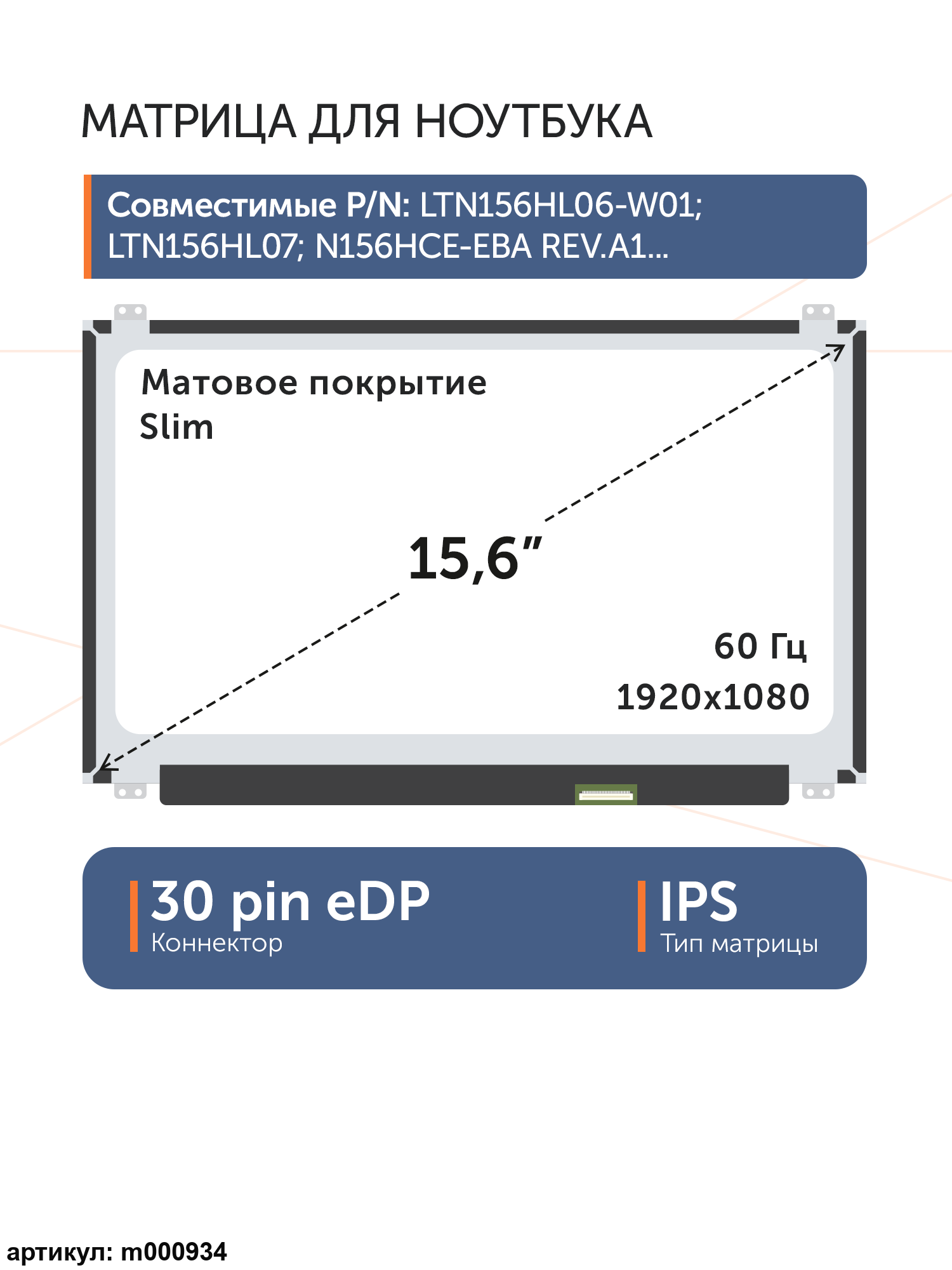 Совместимые модели: NV156FHM-N42, B156HAN01.1, B156HAN01.2, B156HAN04.1, B156HAN04.4, B156HAN06.0, B156HAN06.1, B156HAN06.3, LC156LF2L01, LM156LF1L01, LM156LF1L02, LM156LF1L03, LM156LF6L, LС156LF1L03, LM156LF1L06, LM156LF1L08, LM156LF3L01, LP156WF4-SPA1, LP156WF4-SPB1, LP156WF4-SPC1, LP156WF4-SPD1, LP156WF4-SPH1, LP156WF4-SPL1, LP156WF4-SPL2, LP156WF4-SPK1, LP156WF5-SPA1, LP156WF6-SPK4, LP156WF4-SPU1, LP156WF6-SPA1, LP156WF6-SPB1, LP156WF6-SPB2, LP156WF6-SPB4, LP156WF6-SPB5, LP156WF6-SPB6, LP156WF6-SPC1, LP156WF6-SPF1, LP156WF6-SPD1, LP156WF6-SPL1, LP156WF6-SPL2, LP156WF6-SPM1, LP156WF6-SPM2, LP156WF6-SPM7, LP156WF6-SPN1, LP156WF6-SPP1, LP156WF6-SPP2, LP156WF6-SPK1, LP156WF6-SPK2, LP156WF6-SPK3, LP156WF6-SPK4, LP156WF6-SPK6, LP156WF6-SPH1, LP156WF6-SPH2, LP156WF6-SPH3, LP156WF6-SPJ1, LP156WF9-SPF1, LP156WF9-SPC1, LP156WFC-SPP1, LTN156HL01, LTN156HL02, LTN156HL06 C01, LTN156HL07, LTN156HL09, LM156LF1L, LM156LF6L, LM156LFCL10, N156HCE-EA1, N156HCE-EAA, N156HCE-EBA, NV156FHM-A10, NV156FHM-A11, NV156FHM-A12, NV156FHM-N31, NV156FHM-N41, NV156FHM-N42, NV156FHM-N43, NV156FHM-N46, NV156FHM-N48, NV156FHM-N49, 18010-15620400, 18010-15613900, 18010-15622100, 18010-15623400, 18010-15623800, 18010-15631200, 18010-15632400