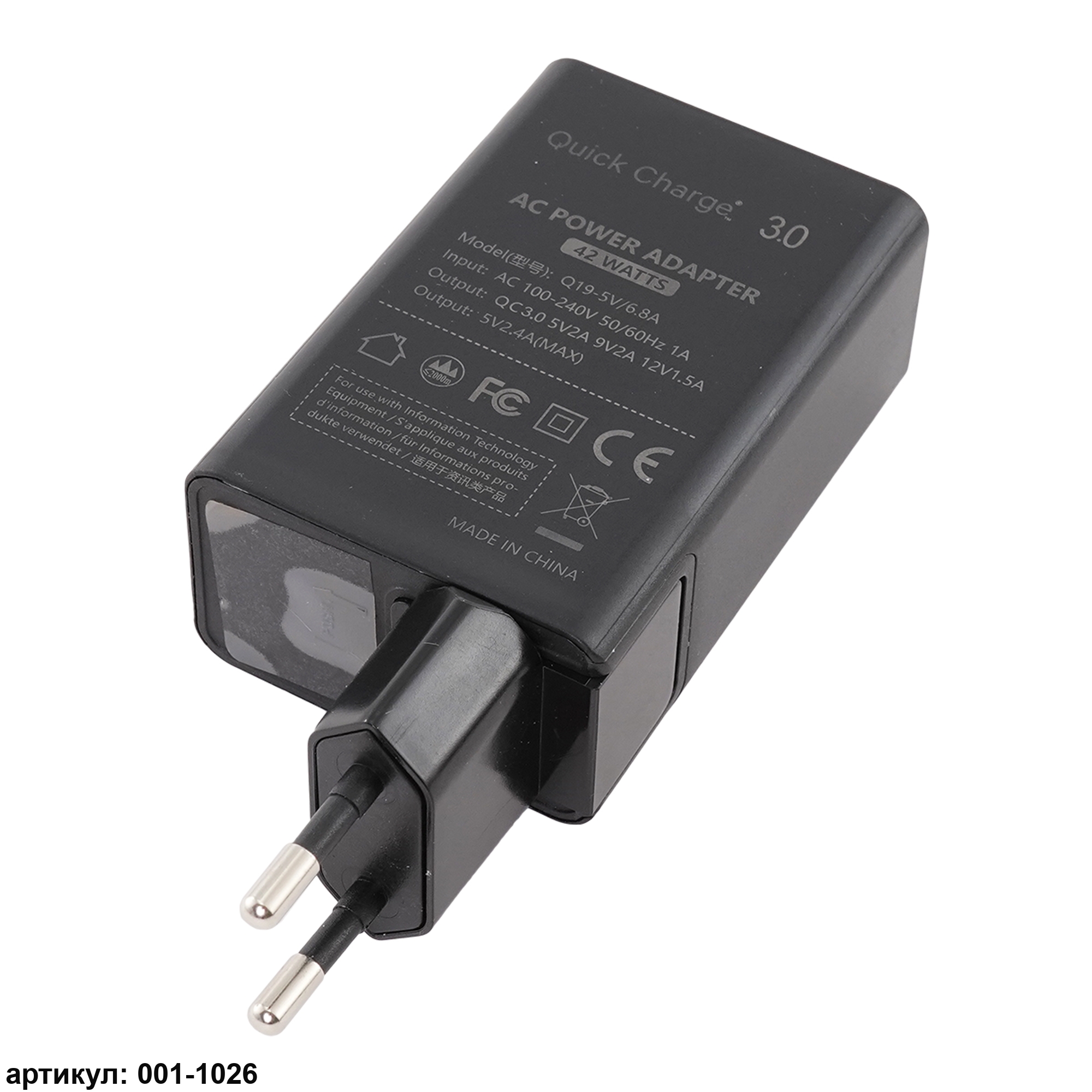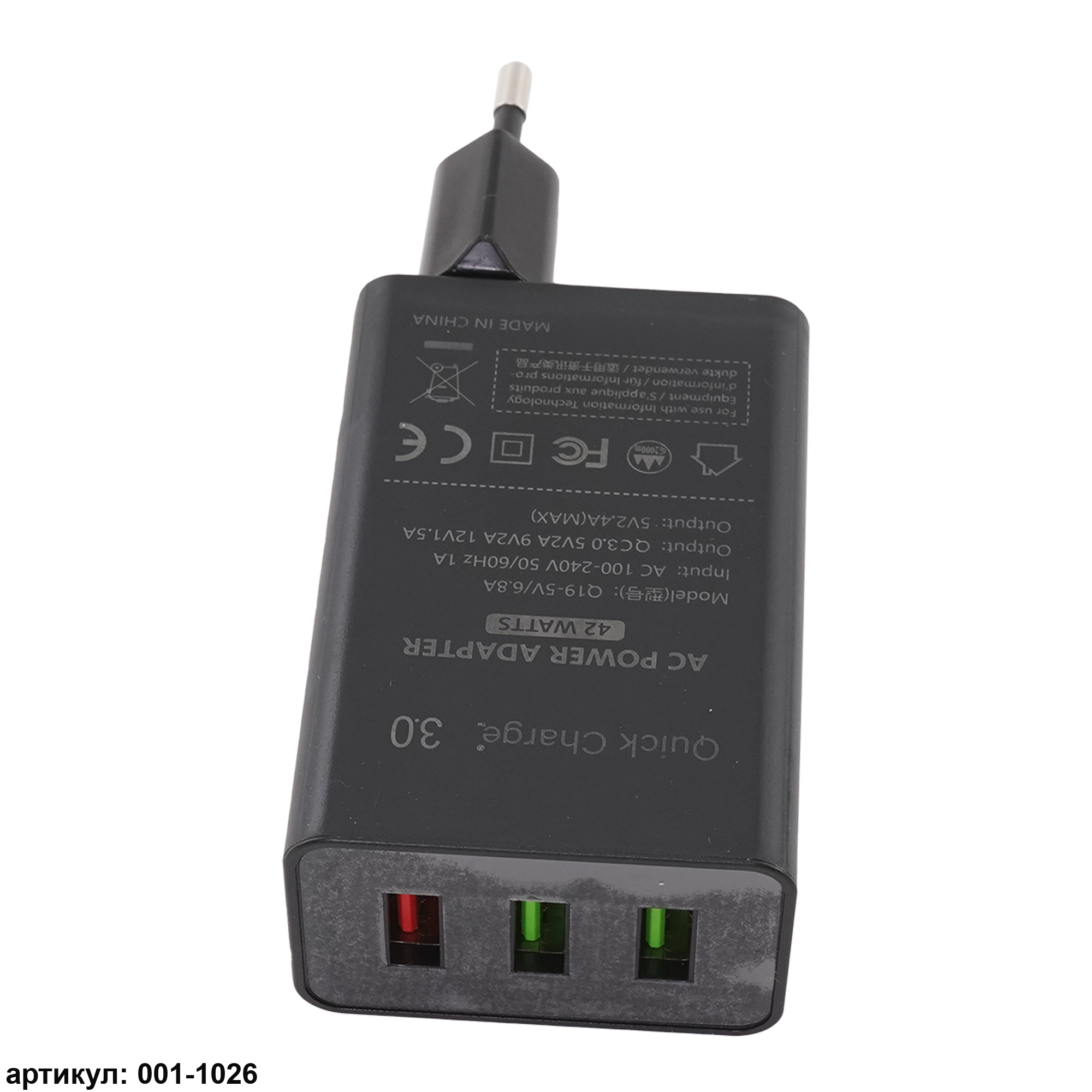 Адаптер питания с полной поддержкой быстрой зарядки Quick Charge 3.0, с 3 USB портами (42W)Входное напряжение (мощность): 100В - 240В, 50/60Гц, 1АВыходное напряжение (зарядка): 5V2A, 9V2A, 12V1.5A3 порта USB для одновременной зарядки 3 устройств